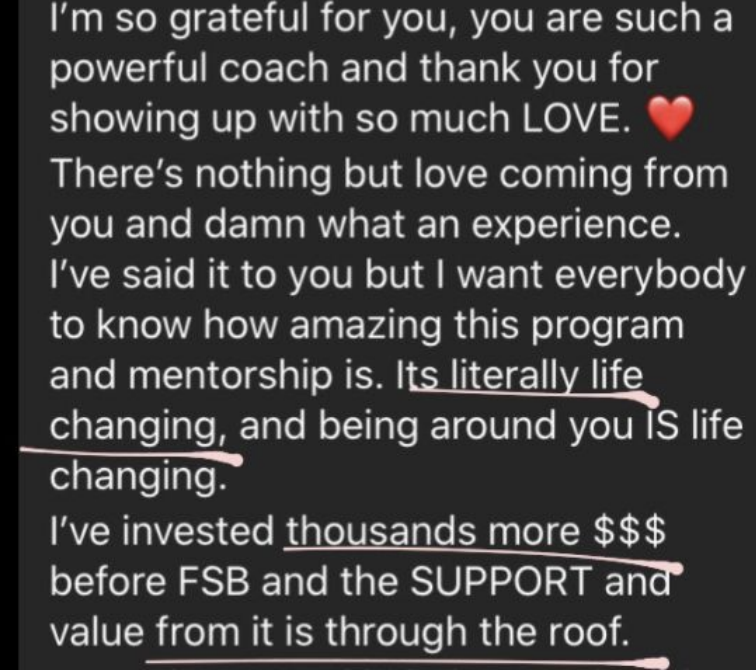You are guided through the FSB Methodology: a proven, 4-stage training process with customized tools + frameworks we workshop 1:1, directly for your own work day and business.